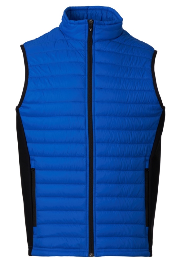 Męska wyściełana (120g/m²) kamizelka z soft-shell po bokach, zapinana na zamek błyskawiczny z tworzywa sztucznego z metalowym suwakiem „semi-auto lock” i spersonalizowanym ściągaczem. Dwie boczne kieszenie z zamkiem błyskawicznym.