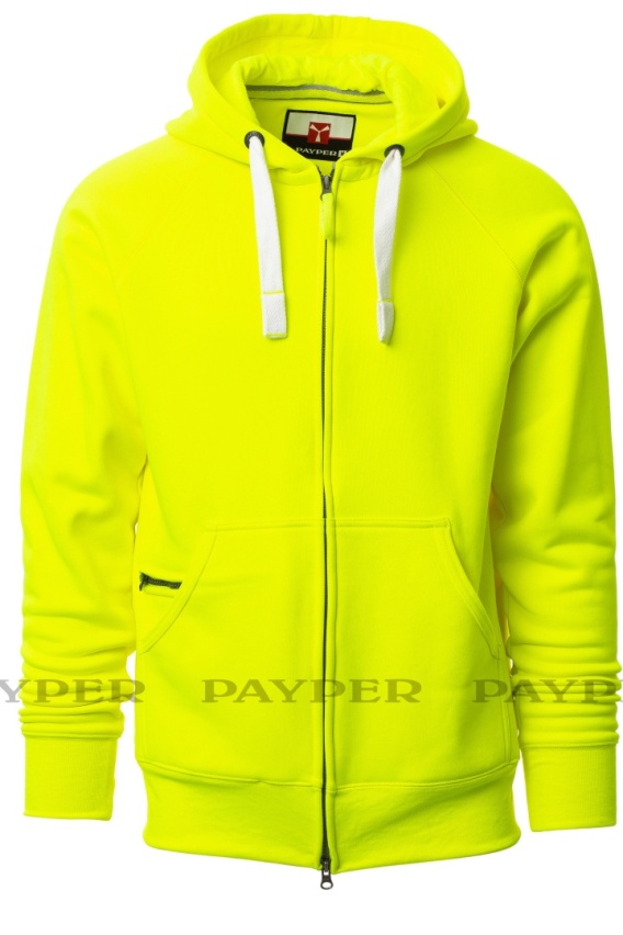Bluza męska z kapturem, rozpinana, zamek błyskawiczny SBS wykończony plastikiem z podwójnym suwakiem metalowym, kaptur z podwójnymi szwami i białym sznurkiem, z kontrastowymi przeszyciami i kółkami metalowymi, rękawy raglanowe, kieszenie-kangurki, kieszonka na zamek błyskawiczny, mankiety i dół ze ściągaczem, wzmocnione szwy.