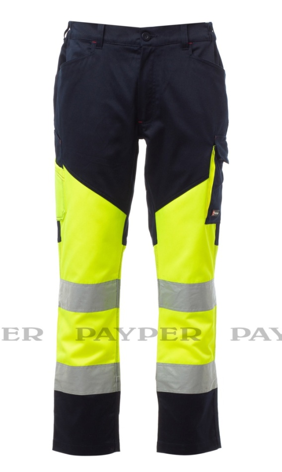 Spodnie unisex, wielosezonowe, dwukolorowe, o wysokiej widoczności, z paskami odblaskowymi, gumkami po bokach i szlufkami w talii. Zapięcie na zamek błyskawiczny i plastikowy guzik, dwie wyprofilowane przednie kieszenie, jedna boczna kieszeń z zapięciem LOCK SYSTEM i zdejmowanym uchwytem na identyfikator oraz druga z podwójnym uchwytem na taśmę mierniczą. Dwie tylne kieszenie: jedna otwarta z paskami odblaskowymi i jedna z klapką i rzepem. Przeszycia pod kolor kontrastujące z tkaniną. Potrójne szwy w kroczu i na wewnętrznej stronie nogawki. Międzynarodowy rozmiar L ma wewnętrzną nogawkę o długości 80 cm.